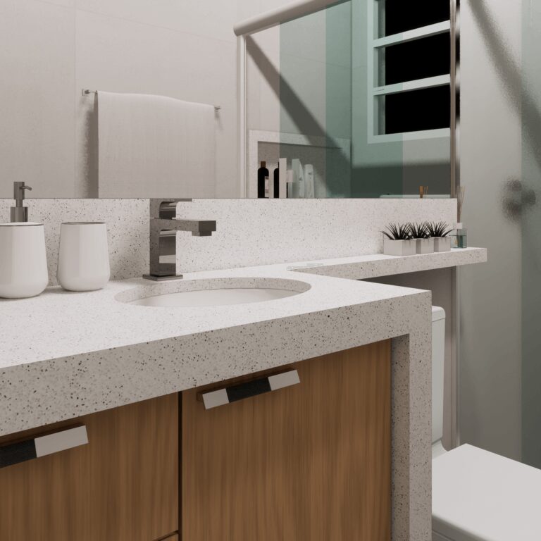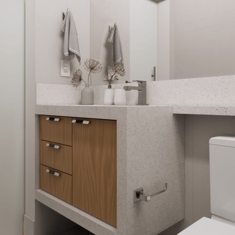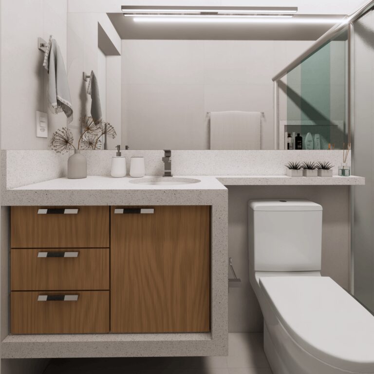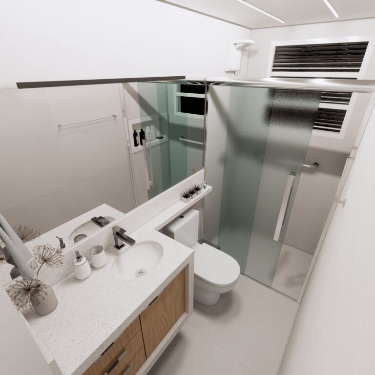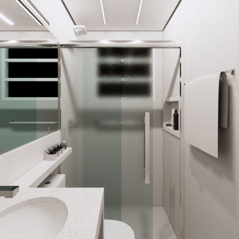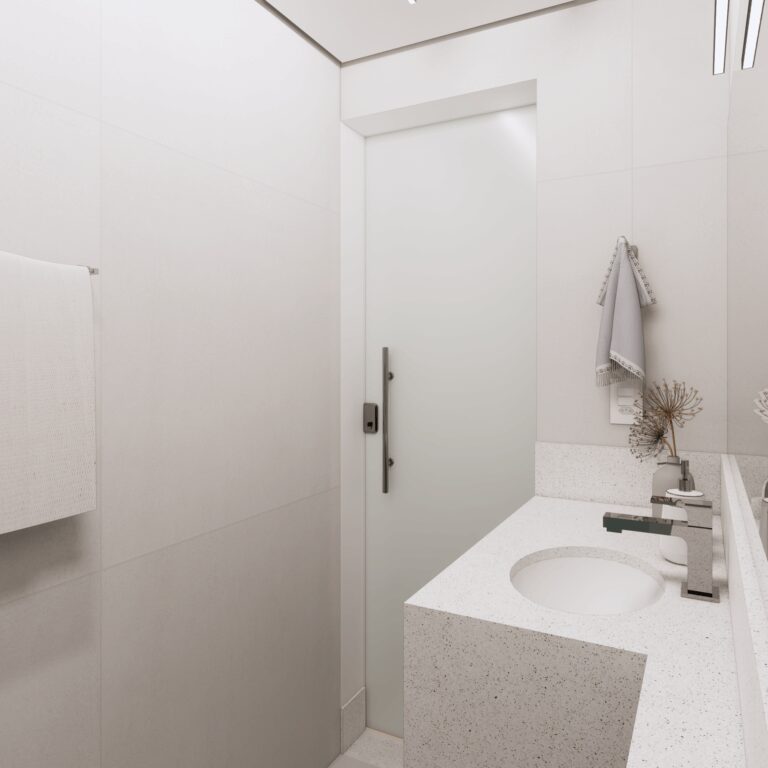 Para alcançar esse objetivo, escolhemos cuidadosamente os materiais e acabamentos que foram não só funcionais, mas também bonitos e sofisticados. Optamos por uma paleta de cores neutras e elegantes, com revestimentos de parede e piso em tons claros. No box, escolhemos um modelo com porta de correr para facilitar o acesso e evitar o acúmulo de água no piso. Ademais, instalamos um chuveiro com um sistema de controle de temperatura durante o banho.