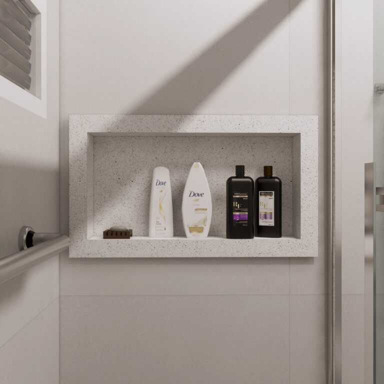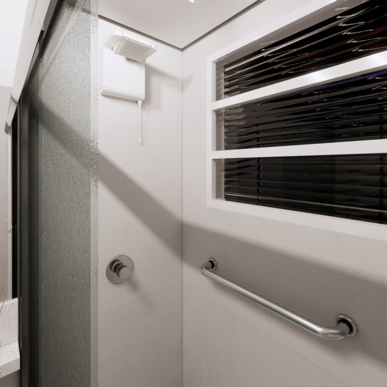 Primeiramente, tivemos que levar em consideração a mobilidade reduzida da nossa cliente. Instalamos uma barra de apoio no chuveiro para garantir sua segurança e independência durante o uso do banheiro. Contudo, também sabíamos que era importante para ela ter um espaço bonito e agradável esteticamente.